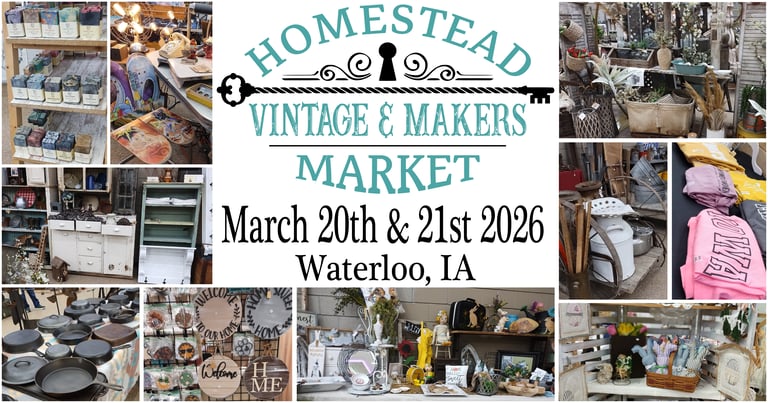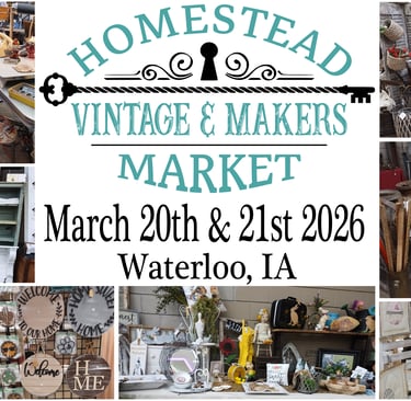 The Homestead Vintage and Makers Market is the can't miss market in the Cedar Valley this spring. Offering the best hand selected vintage, antique, hand crafted, artisan, boutique, reclaimed and repurposed vendors from all over Iowa and beyond! Escape the winter blues! Join us March 20th and 21st 2026 at the Waterloo Convention Center for 2 days of shopping small with live entertainment, kids activities, and an amazing downtown to experience while you are here. $5 admission with children under 14 years FREE. See you at the Homestead Vintage and Makers Market!